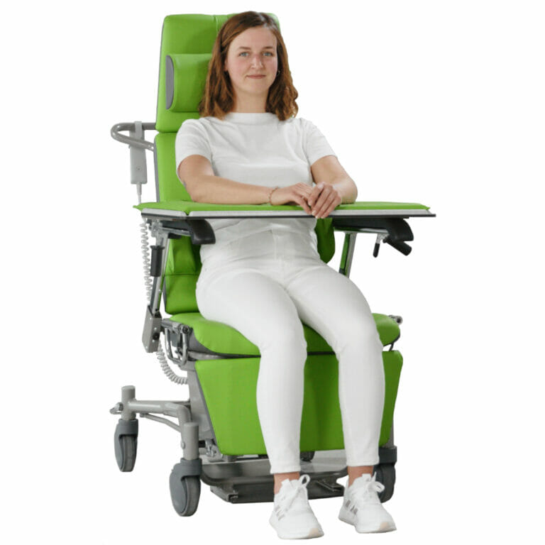 Das Gerät setzt Maßstäbe in Bezug auf Servicefreundlichkeit und Hygiene. Die simultane Verstellung von Rückenlehne und Sitzneigung ermöglicht eine stufenlose Anpassung von einer stabilen Sitzposition bis hin zu einer aktivierenden Aufstehhilfe. Die unabhängige elektrische Höhenverstellung unterstützt zudem eine rückenschonende Arbeitshaltung des medizinischen Personals.